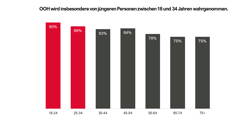 Besonders deutlich zeigt sich die Stärke von Digital Out of Home (DOOH) in der Zielgruppe der 19- bis 34-Jährigen: Laut den Studien von Prof. Dr. Rainer Höger und Scopience nehmen über 90 % dieser Altersgruppe digitale Außenwerbung aktiv wahr – ganz gleich, ob beim Pendeln, beim Stadtbummel oder im Umfeld von Freizeitaktivitäten. Noch wichtiger: DOOH wird in dieser Zielgruppe nicht nur gesehen, sondern auch als besonders glaubwürdig, modern und hochwertig wahrgenommen. Der sogenannte Trust Grade liegt hier signifikant höher als bei klassischen Online-Ads oder Social-Media-Werbung. Junge Erwachsene bewerten DOOH als realitätsnah, präsent und vertrauenswürdig – und genau das macht es zu einem idealen Kanal, um Markenbindung und Kaufimpulse nachhaltig aufzubauen.